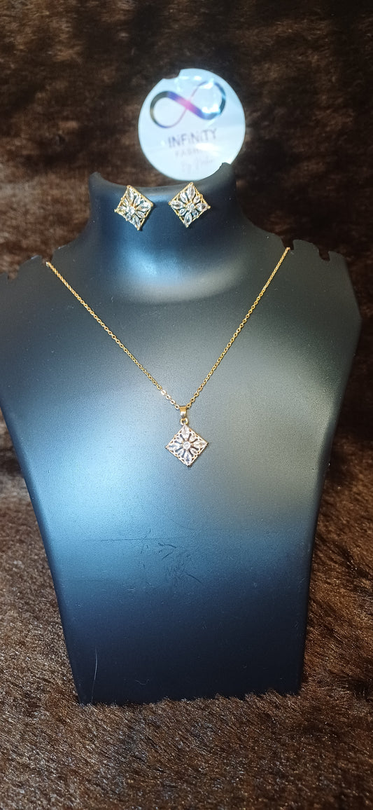 Square cut crystal studded pendant and chain with matching earrings