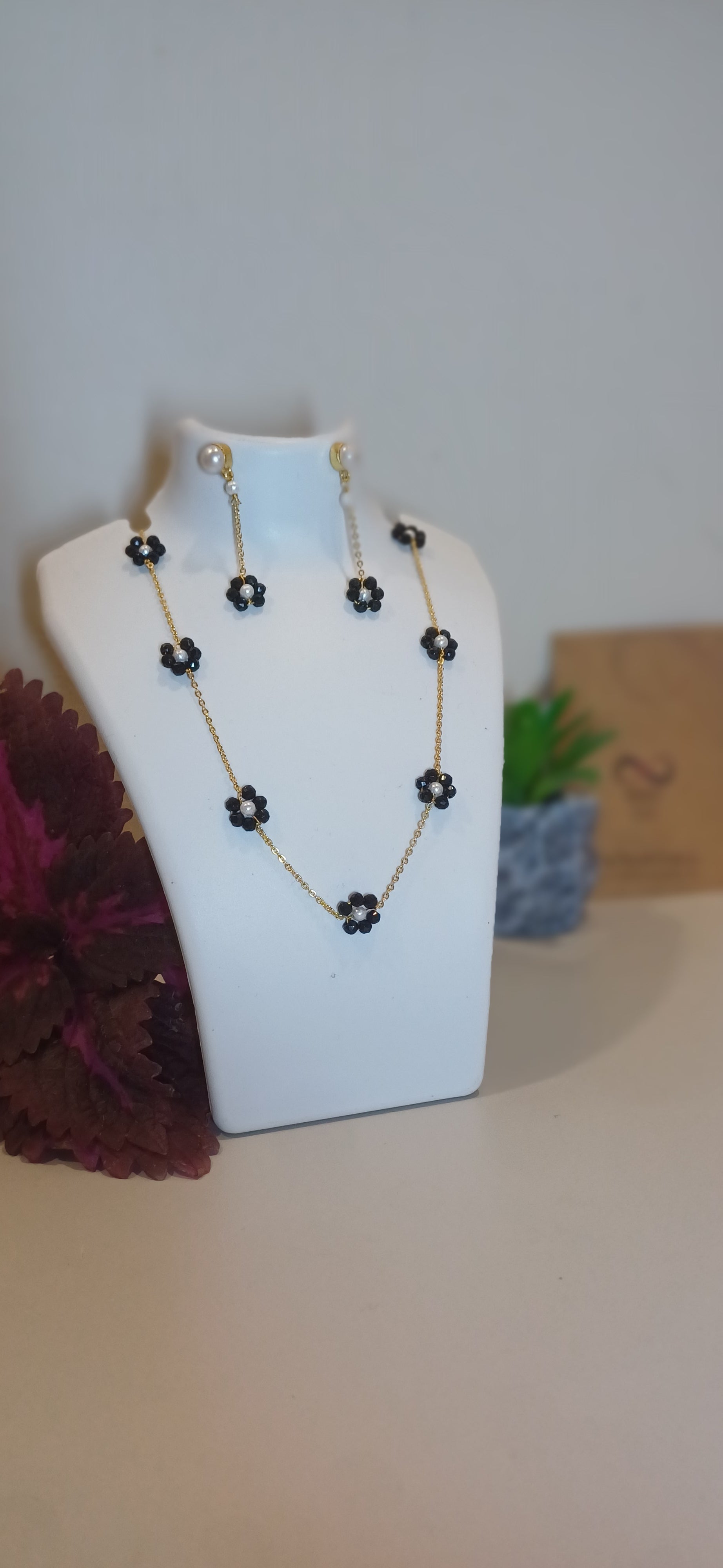 Black flowers golden chain with matching earrings_anti tarnish_lightweight