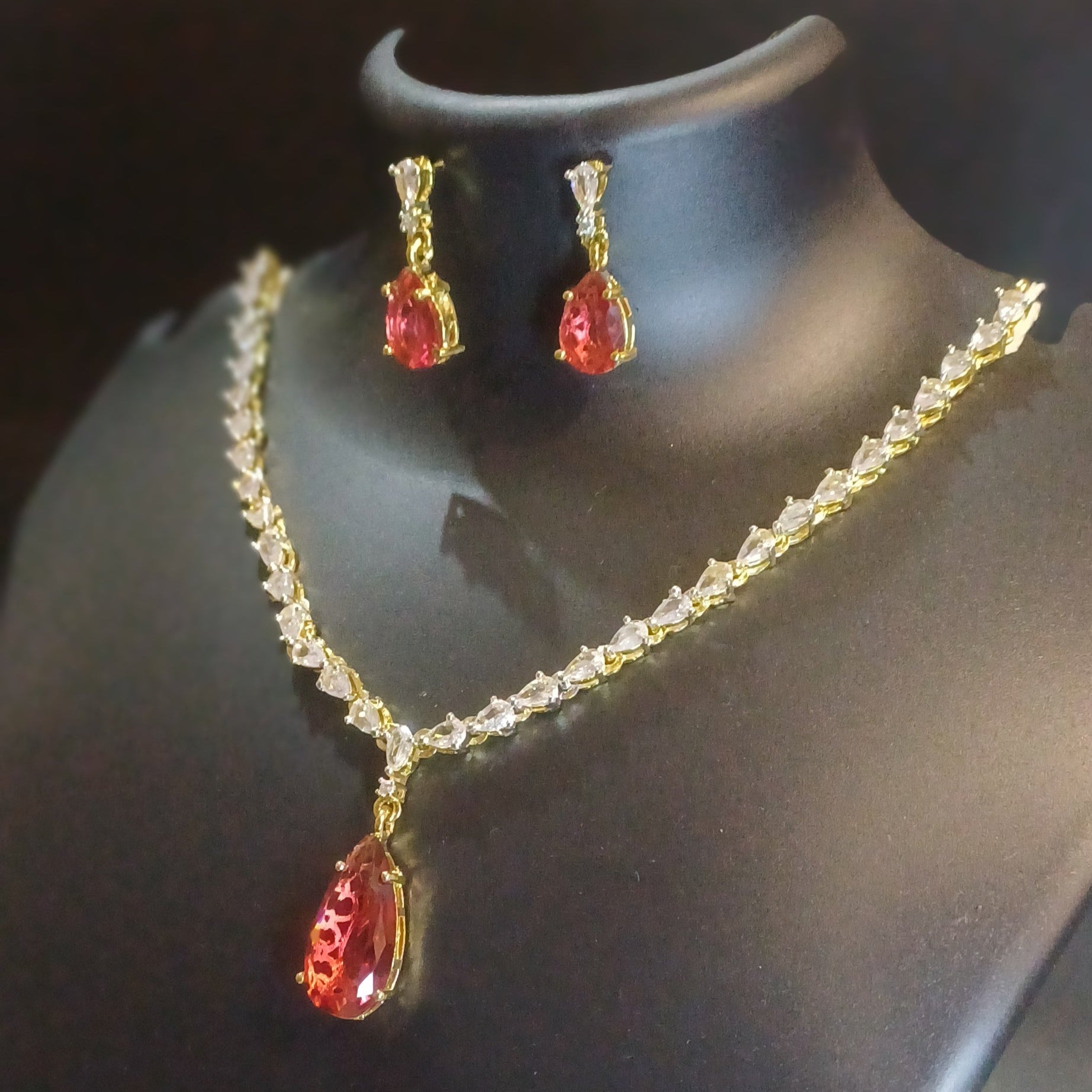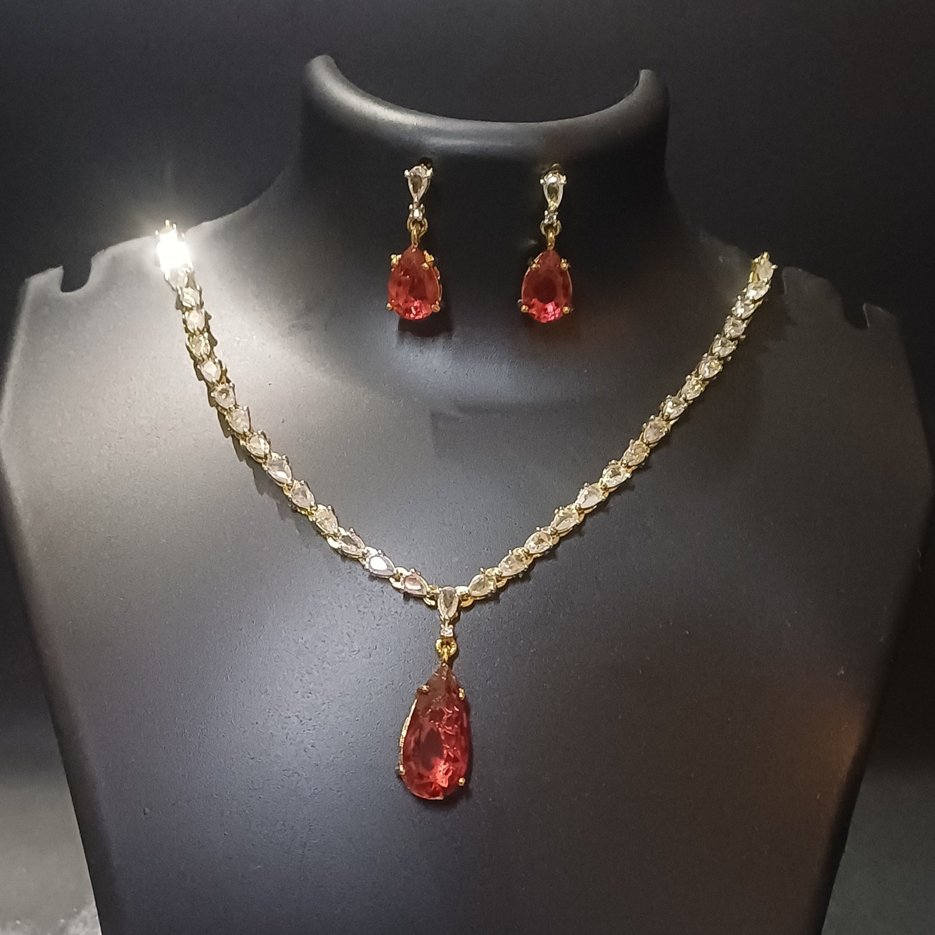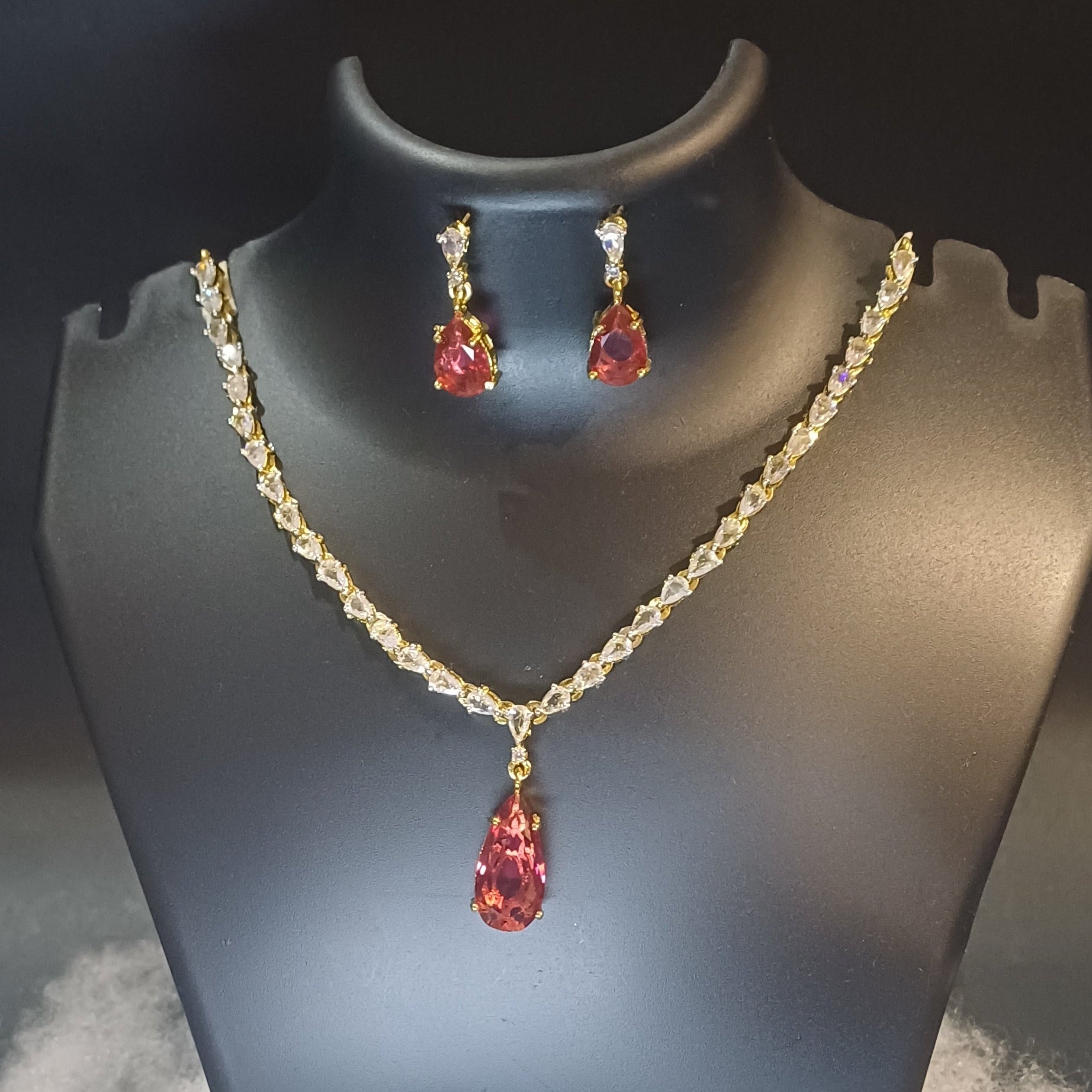 Indulge in elegance and sophistication with our Red Stoned Metallic Golden Designer Necklace and Earrings set. The single lined design features gorgeous red stones on a shimmering golden base, creating a luxurious and eye-catching look. Elevate your style with this stunning accessory and make a statement at any occasion. Infinity Fashion