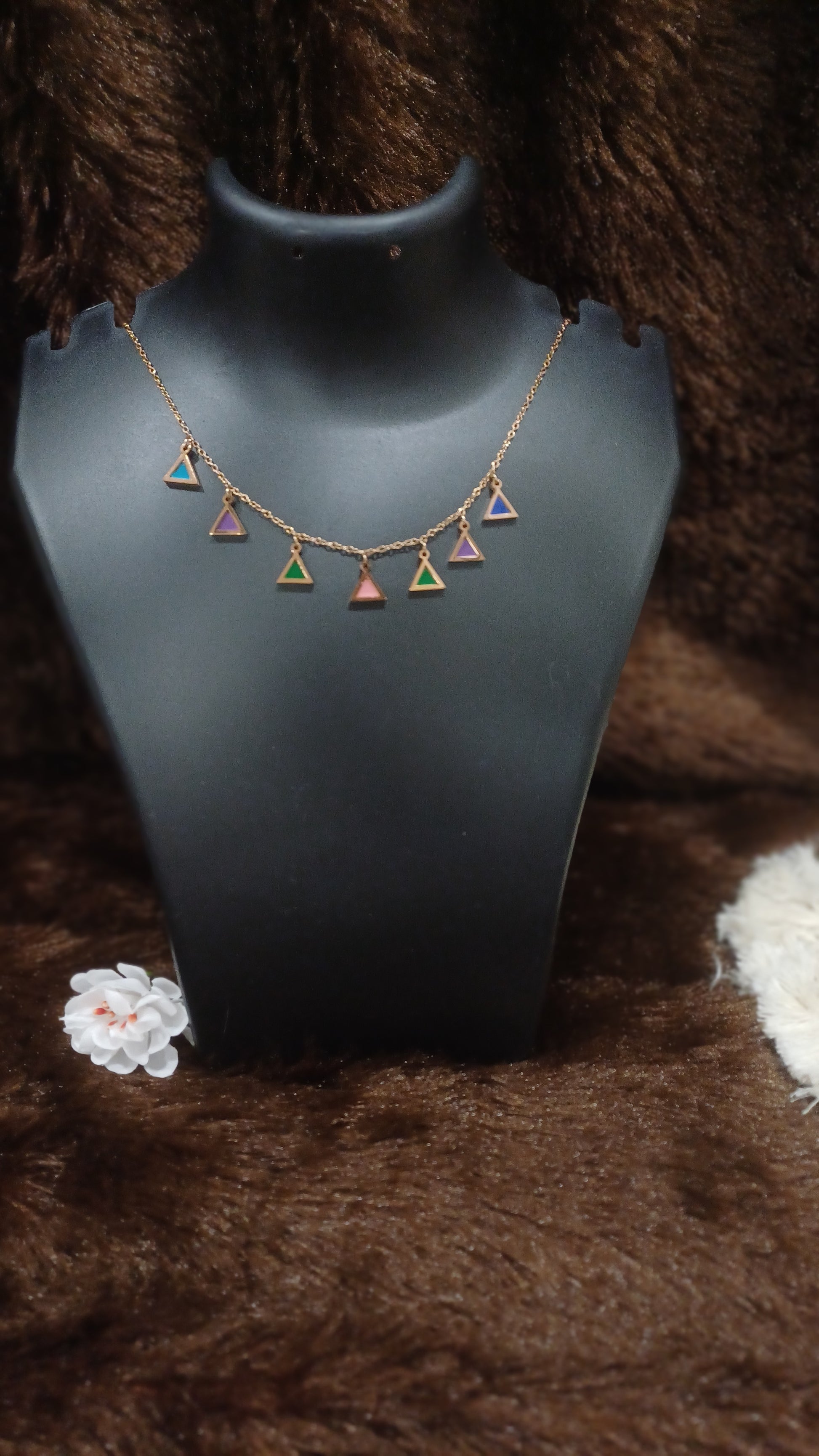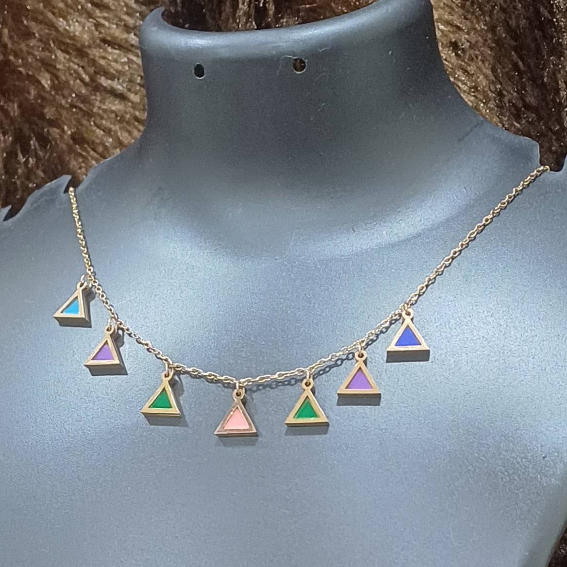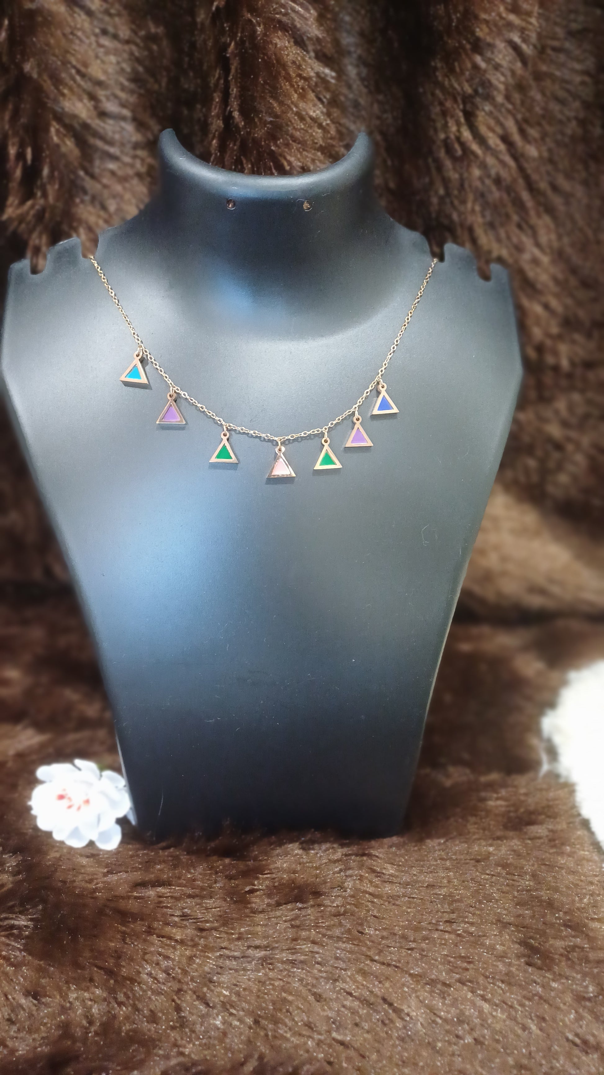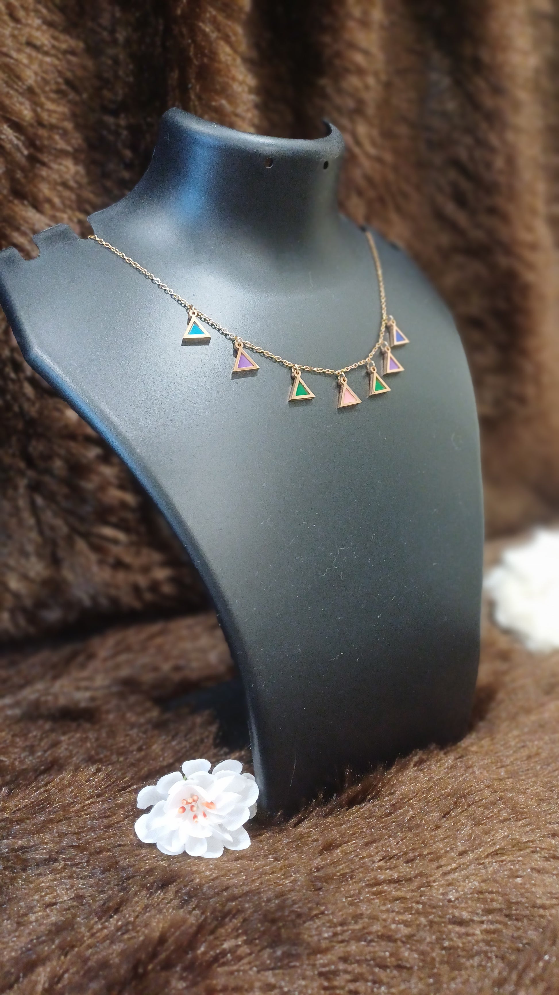 Experience the vibrant colors and sleek design of our Tesselled multicolor neck chain. Crafted to resist tarnishing, this statement piece will add a touch of glamour to any outfit. A must-have for any fashion-forward individual!